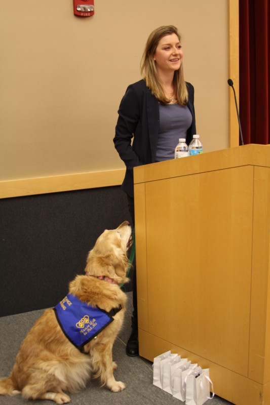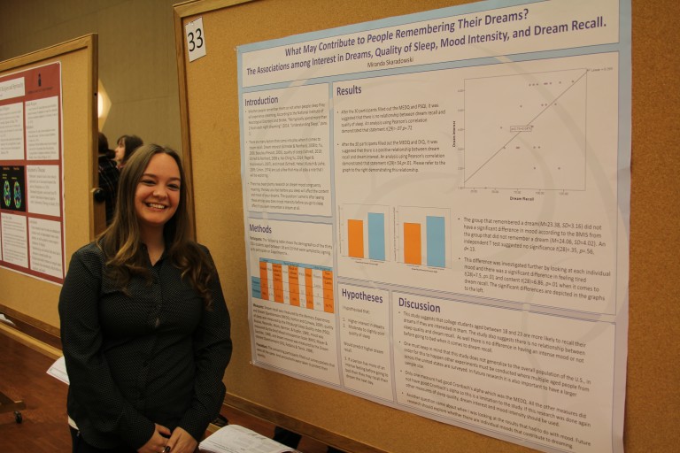 Senior Psychology major Alexandra Steel was one of the students who presented research at the event. With the help of faculty mentor and psychology professor Peter Bachiochi, Steel conducted a research project titled, “Animal Assisted Therapy, Mood and Social Facilitation.”