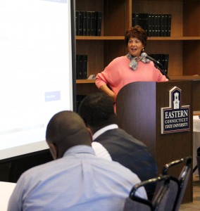 Rosie Hernandez thanks Occum Hall residents for their support of Puentes al Futuro