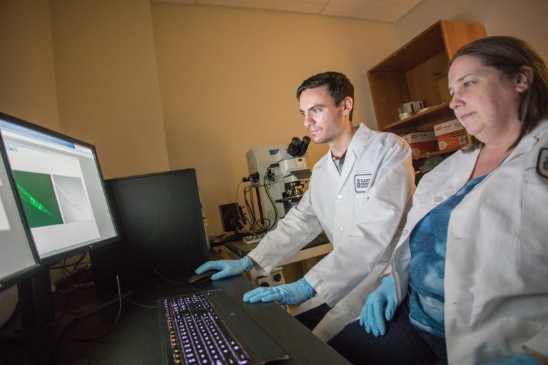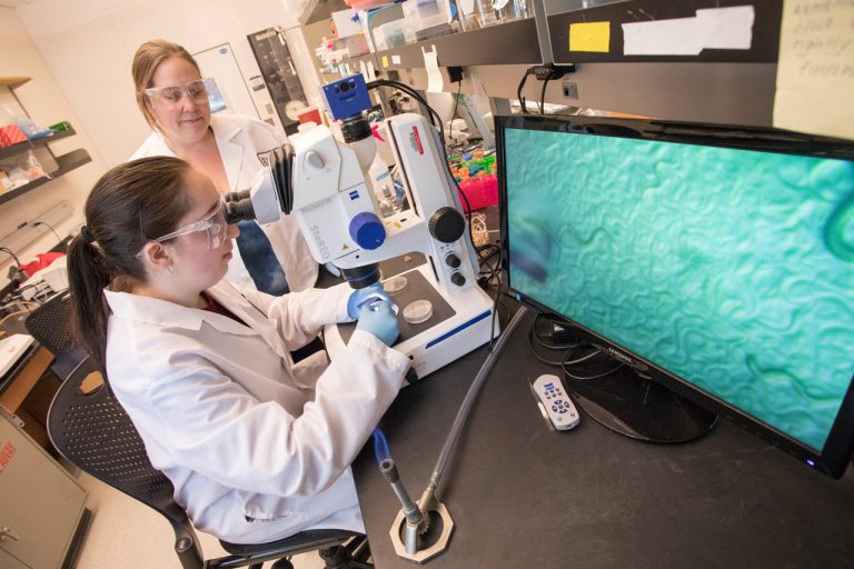 Eastern Connecticut State University Biology majors Christianne Senechal '18 of Amston and Jonathan Rappi '18 of Southington are assisting Eastern Biology Professor Amy Groth with a complex research project that uses microscopic worms to study genes that are important for human development and disease, including cancer.