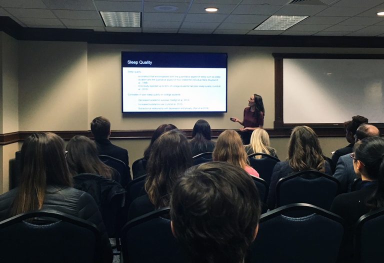 Eastern student Elizabeth Hilton ’18 presents “Sleep Hygiene, Psychological Distress and Acceptability of Sleep Hygiene Practices in College Students” to a packed room at NCUR 2018.