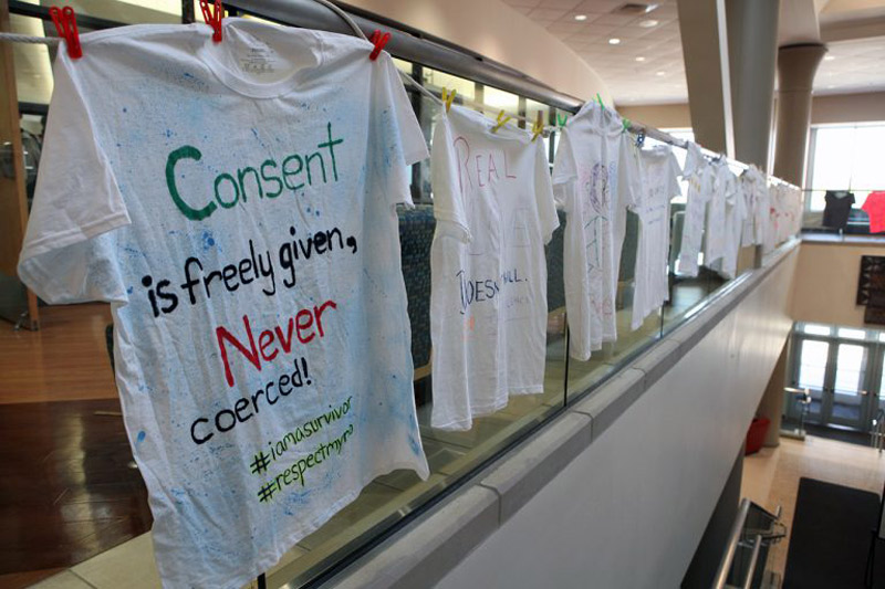 As a visual display of survivor support, Eastern also launched the Clothesline Project. Displayed from Oct. 25-31, the project displays shirts with messages and illustrations designed by survivors of sexual assault, dating violence and domestic violence. The purpose of the project is to increase awareness, destabilize stereotypes about “victims,” celebrate survivor strength and to provide another avenue to courageously break the silence that often surrounds these experiences.