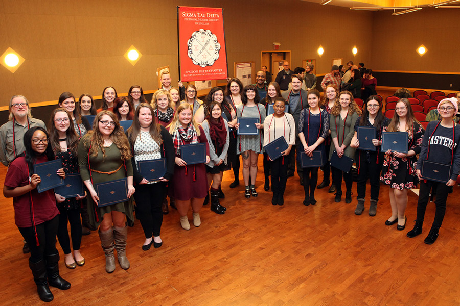 Following the awards ceremony, 32 students were inducted into the Sigma Tau Delta international honor society. In order to qualify, English students must have completed a minimum of four 200-level English courses, a minimum average GPA of 3.5 in English courses, and an overall 3.0 GPA. Members are eligible for select scholarships, internship opportunities and other benefits.