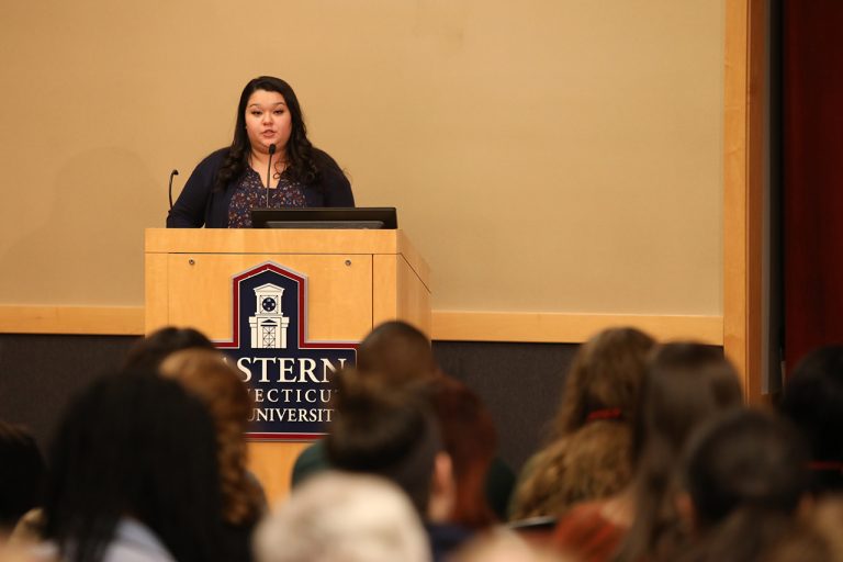 Monica Muriel ’19 presented “The Misrepresentation of Crime in the Media and Its Detrimental Effects on the Public,” and Ashlee Shefer ’19 presented “The Safest Place on Earth.” Following presentations, English Night attendees engaged in a poster session, viewing senior projects by Mikayla Fish ’19, Jolee Iannantuoni ’19, Zoe Stephen ’19, Jessica Maloney ’19 and Alec Taylor ’19.
