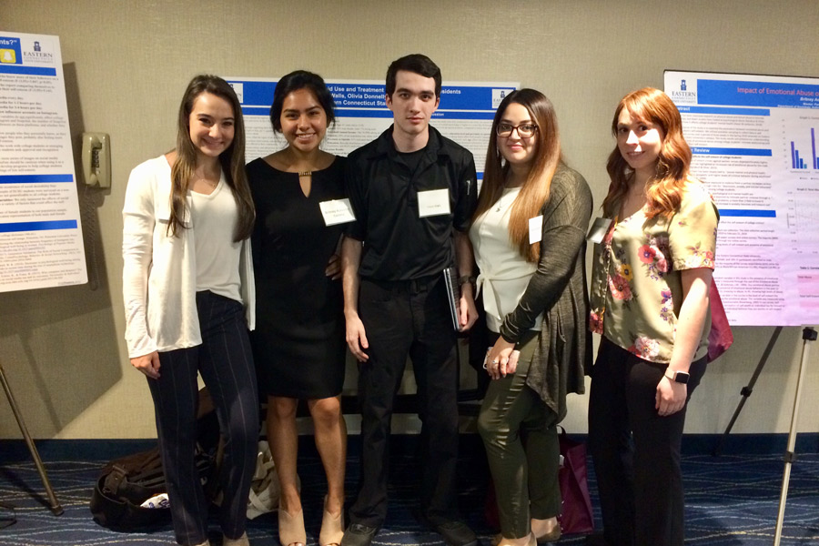 Student presenters included Alex Casertano and Marena Dees, whose presentation “Followers & Streaks: Does Social Media Use Boost the Self-Esteem in College Students?” won second place; and Britney Acevedo-Corona, whose presentation “The Impact of Emotional Abuse in Dating on College Students’ Self-Esteem” took home fourth place. Jimarie Morales and Marangely Diaz presented “Why Don’t You Call? Barrier to Child Maltreatment Reporting in a Financially-Disadvantaged Town,” and Travis Walls, Logan Cash and Olivia Donnelly presented “Knowledge of Opioid Use and Treatment among Willimantic Residents.”
