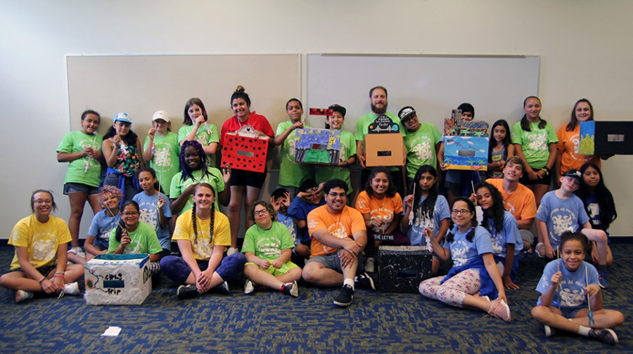 For this summer’s Puentes program, the children were broken into six groups and tasked with creating original Lambe Lambe performances. Assisted by seven Eastern student volunteers, the groups wrote and recorded scripts, designed boxes (sets and scenery) and characters, and rehearsed for final performances.