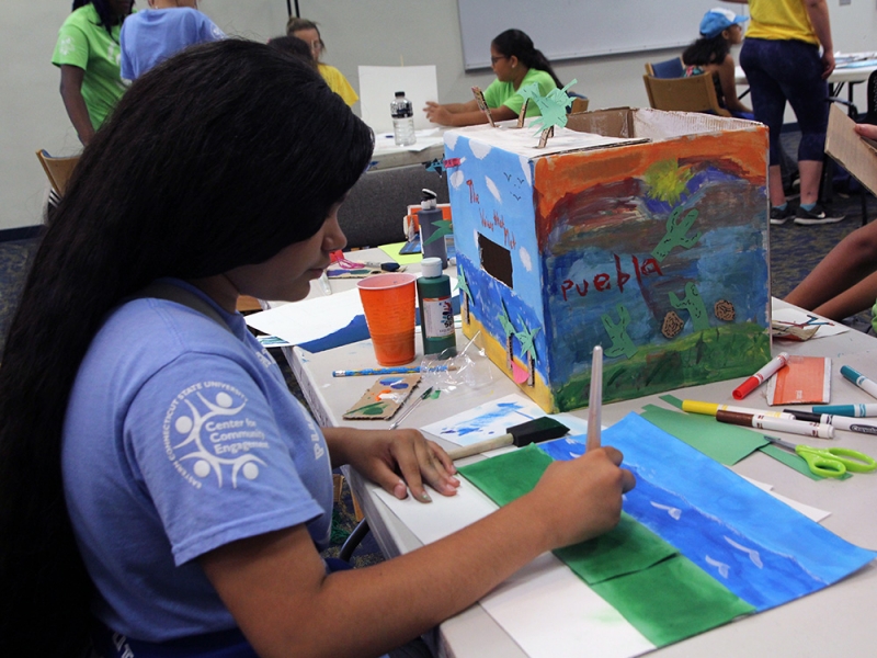 Puentes al Futuro (Bridges to the Future) is the Center for Community Engagement’s (CCE) annual summer camp for local middle school kids. In recognition of Willimantic’s Hispanic community, the educational program spotlights Latin American culture and is funded by a generous grant from the Jeffrey P. Ossen Foundation. This year’s theme was Lambe Lambe.
