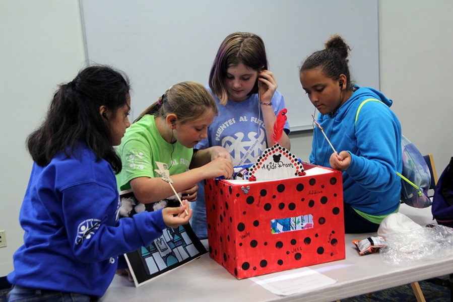 “Everyone contributed something different to the project,” said CCE volunteer Katelyn Root ’19. “Some kids loved writing stories, others specialized in art. Every talent was used to create the puppet shows.”