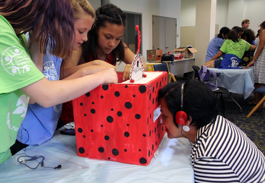 The month-long camp culminated on July 25 with final performances on campus. Dozens of family and community members gathered into a crowded and unexpectedly silent room in Mead Hall. Careful to not disturb their audiences — six performances happening simultaneously — the children intently worked their puppets as others shifted backdrops in and out of boxes. One two-minute show after the other, family and friends took turns peering into boxes. As the curtains closed, each spectator removed the headphones with a smile.