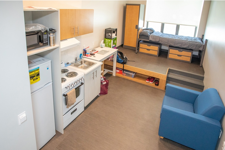 The building has capacity for 91 residents. The residential suites include single apartments with kitchenettes, sitting areas, breakfast bars and lofts for bedroom furniture. Three- and four-person suites feature private bedrooms, kitchens and separate bath and toilet facilities.