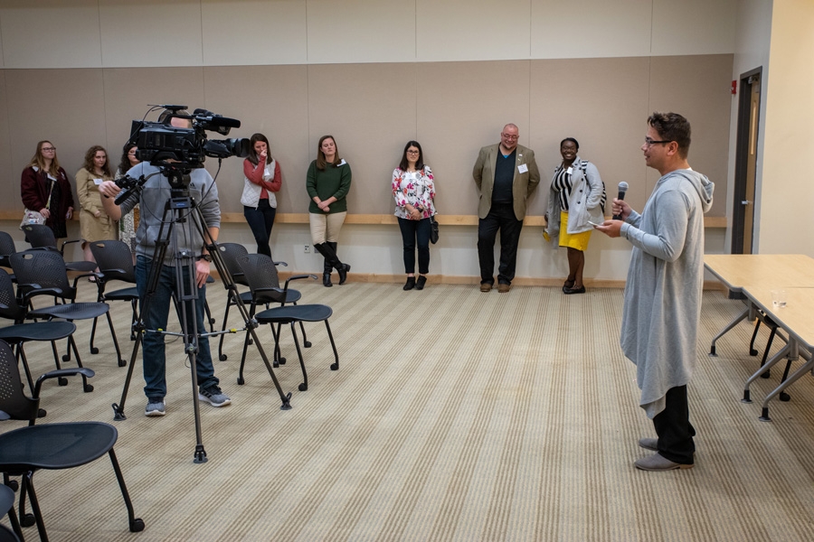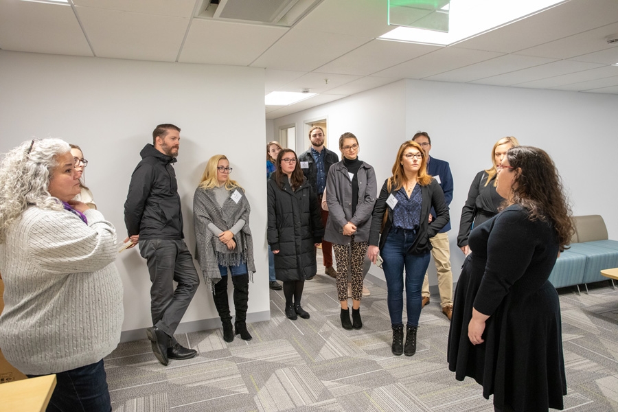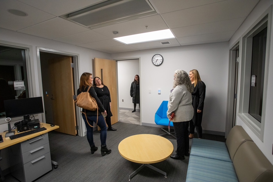 After the reception, alumni were taken on a tour of the Psychology Department’s new labs in Goddard Hall by Professor Lyndsey Lanagan-Leitzel. The new space includes a lounge for students and discussion rooms for group work, as well as subject rooms that are fully equipped with video monitoring systems and microphones. Some subject rooms include two-way mirrors where students and professors can observe subjects from the other side. The new space also has a food lab that is equipped with kitchen appliances and is intended to allow research on eating behavior.