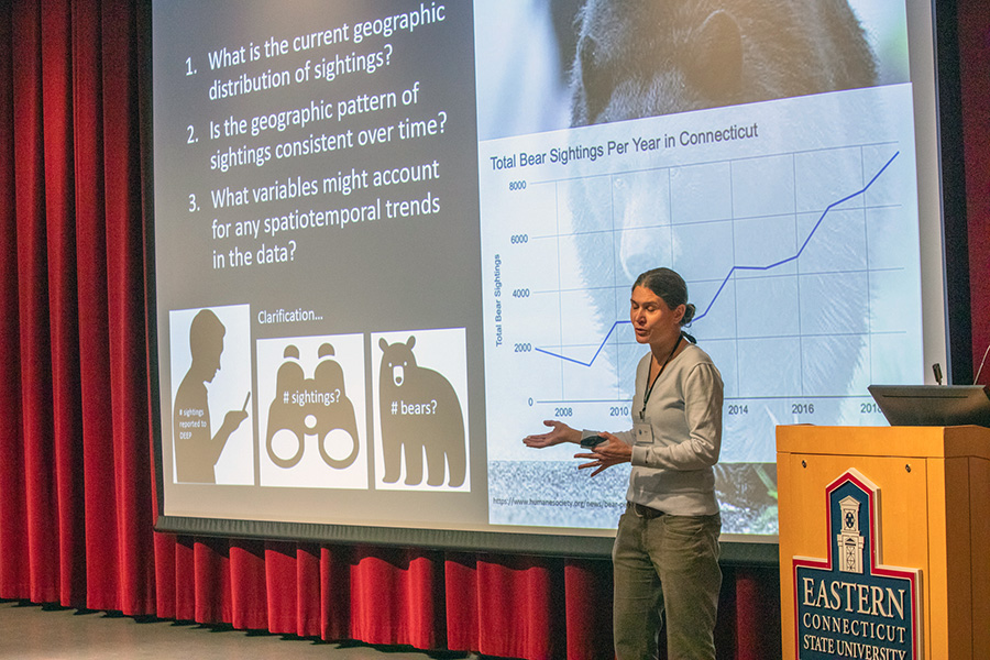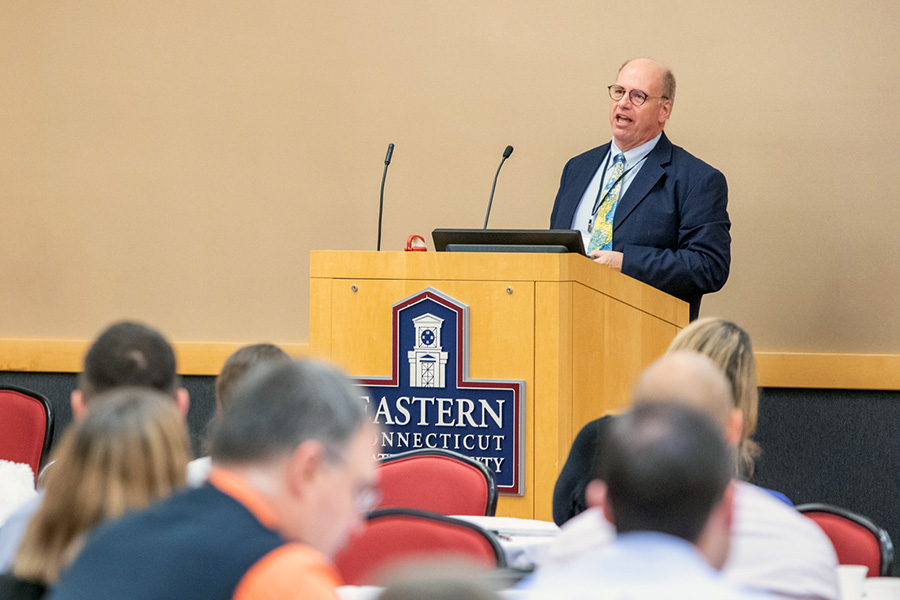 The event opened with welcomes from Provost William Salka, Environmental Earth Science Professor Meredith Metcalf and Lecturer Aaron Nash, president of the GIS User Network. Salka reminded guests that Eastern offers a GIS minor, and the University is working towards creating a GIS certificate. Nash informed guests that GIS is developing into an international movement, with millions of users around the world. This is the 18th year of GIS day in Connecticut since its creation in 2001, when it was hosted at the Legislative Office Building in Hartford as a means to educate legislators about the uses of GIS.