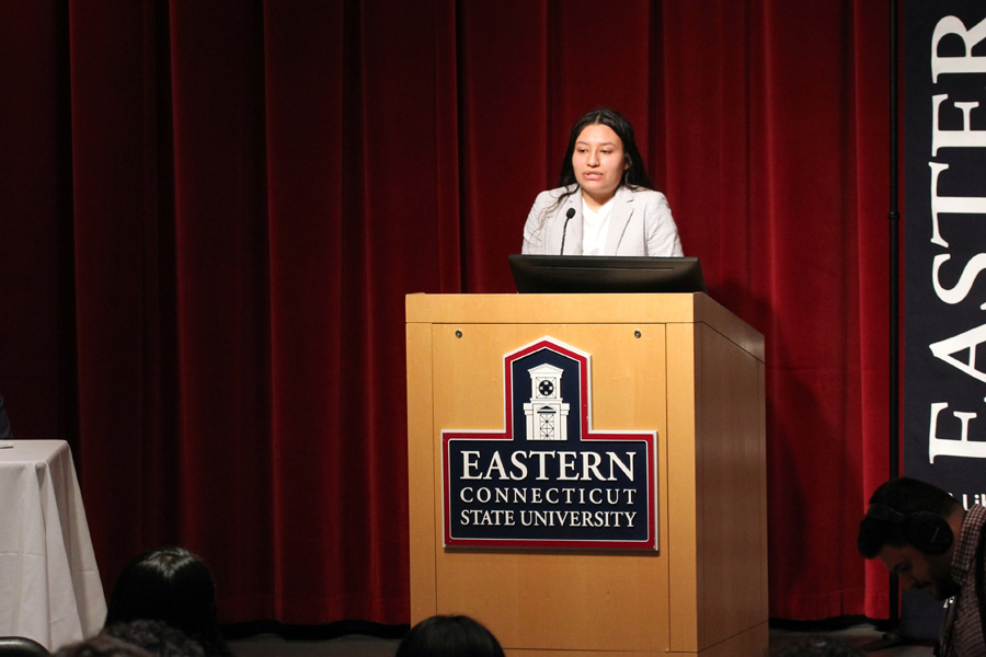 The press conference featured several speakers voicing support for the DACA program, including Connecticut Attorney General William Tong; Mark Ojakian, president of the Connecticut State Colleges and Universities; Eastern President Elsa Núñez; and Eastern students Maria Elena Ruiz Gonzalez, Yineira Lopez and Yenimar Cortes.
