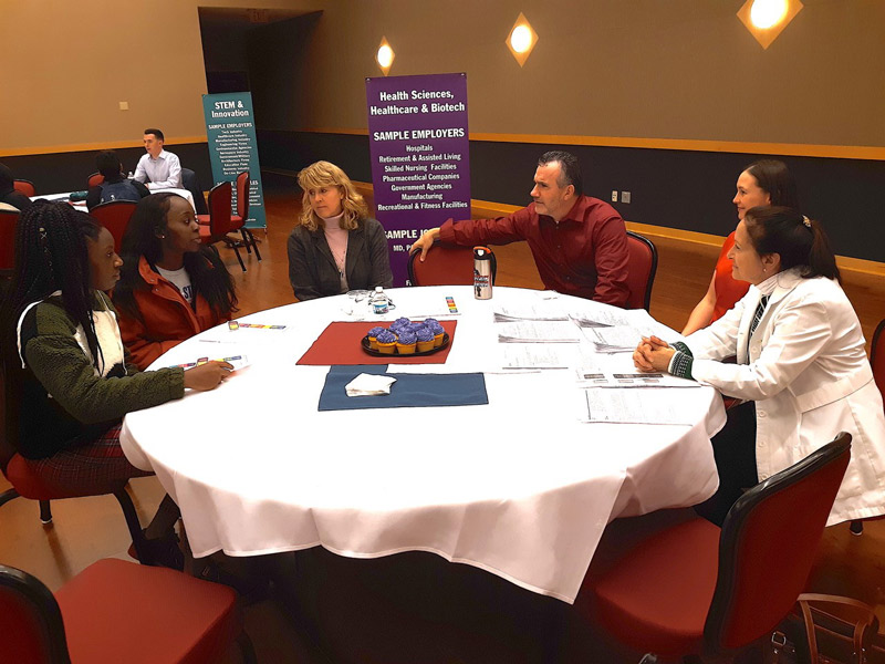 The expo was a casual, low-key event, complete with food, relaxed conversation and prizes, designed to expose students to a variety of career clusters. Representatives participating in the expo reflected career clusters that correspond to Eastern’s majors, including the areas of Accounting and Financial Services; Arts; Entertainment; Media and Marketing; Business Management and Administration; Education and Training; Government; Law and Public Policy; Health Sciences; Health Care and Biotech; Human Services; and STEM and Innovation