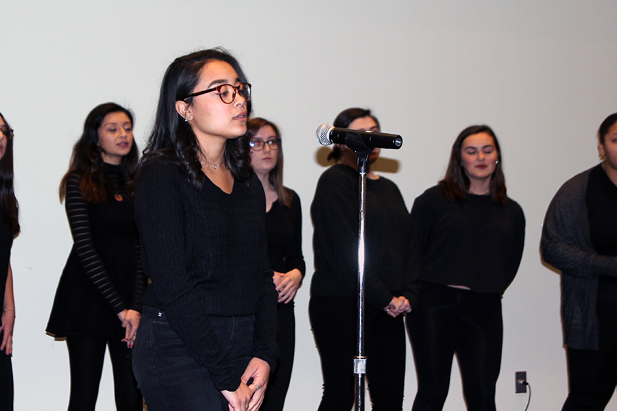 During “Ribbons of Remembrance,” names of loved ones lost to suicide were written on ribbons tied to a tree and candles were lit in their memory as the names were read aloud. Janet Bannister ’19 and Gerda Walz-Michaels read poems; the student groups Modern Movement and Key of She performed dances and sang acapella songs, respectively; and Father Larry LaPointe offered words of encouragement.