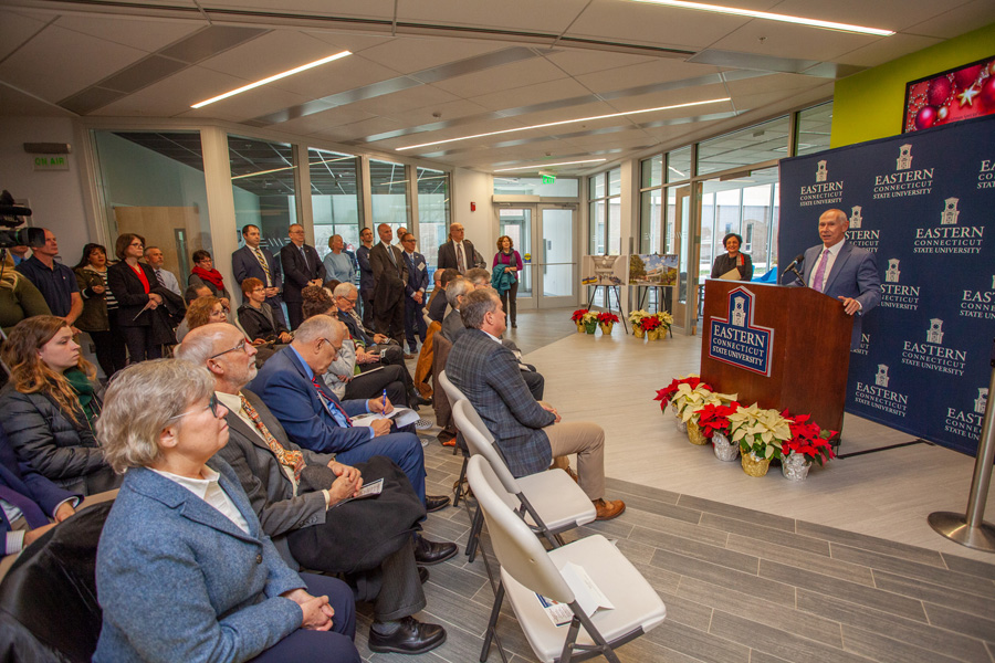 Eastern Connecticut State University held a formal ribbon-cutting on Dec. 16 to celebrate the re-opening of the Communication Building and Goddard Hall. Members of the campus community gathered in the lobby of the Communication Building to hear University officials, state dignitaries and project representatives applaud the successful remodeling of two historic buildings.