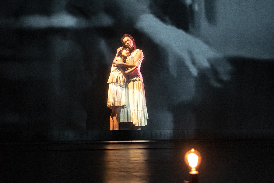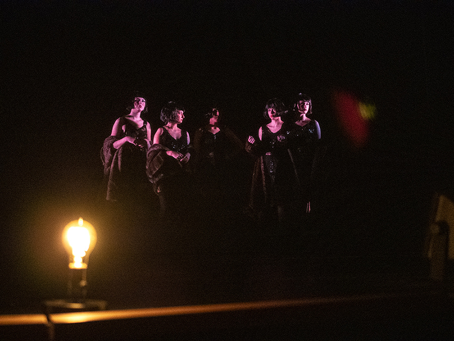 The opera told the story of Lulu, a homeless child living in Vienna in the late 19th century who is raised by a predatory father figure. As a result of her childhood trauma, she grows up to become a seducer who rips through the lives of all who love her. The opera mixed vintage films that serve as a backdrop with Lulu’s outspoken, vivid rap to create an incisive and engrossing performance. New Media Studies students Jenique Blair and Aubrie Curcio helped with the programming to digitally project footage edited by Dylan Amick, one of the Ridge Theater guest artists, from hours of silent movies and old films.