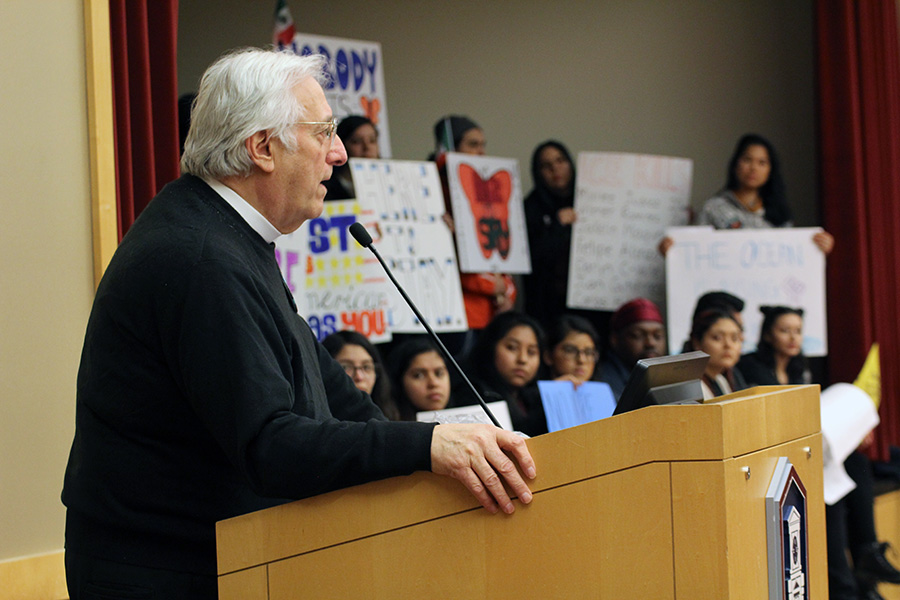 Father Larry LaPointe of Eastern’s Campus Ministry quoted a poem from Martin Niemöller, who survived the German concentration camps in World War II. “First they came for the socialists, and I did not speak out, because I was not a socialist. Then they came for the trade unionists, and I did not speak out, because I was not a trade unionist. Then they came for the Jews, but I did not speak out, because I was not a Jew. Then they came for me, and there was no one left to speak for me.”