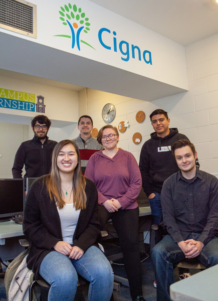 Several Eastern Connecticut State University students are participating in a unique internship with Cigna through the health services company's on-campus Technology Early Career Development Program (TECDP). Cigna created the program to provide interns--and potential future employees--with opportunities to gain experience in the biz-tech fields of information technology (IT).