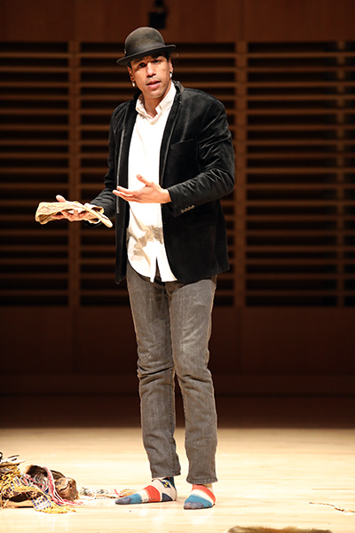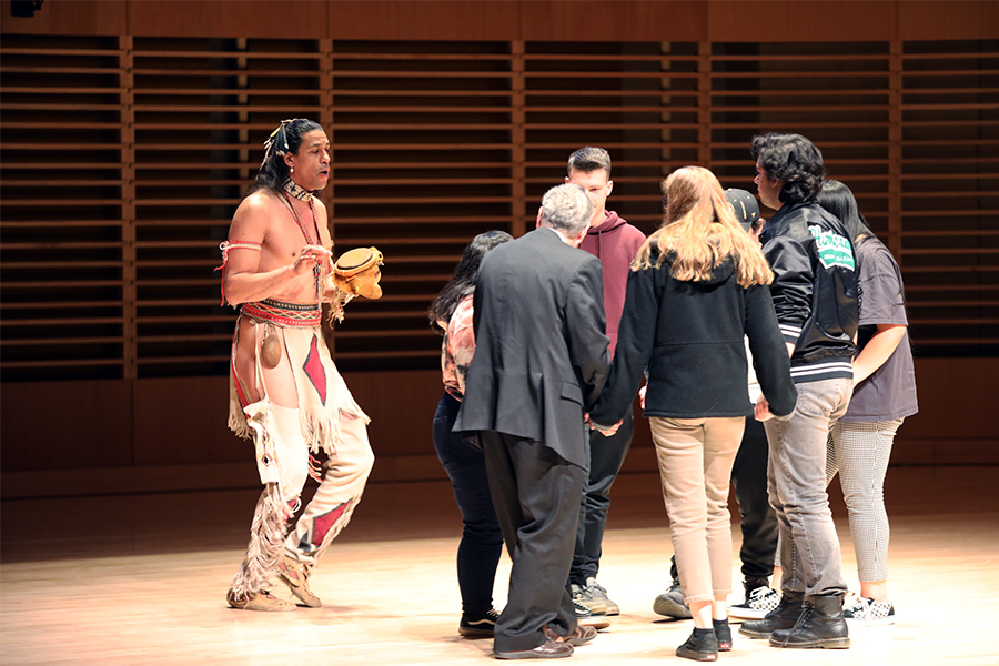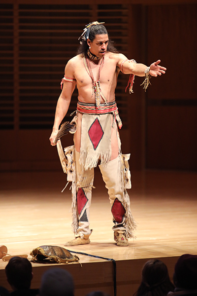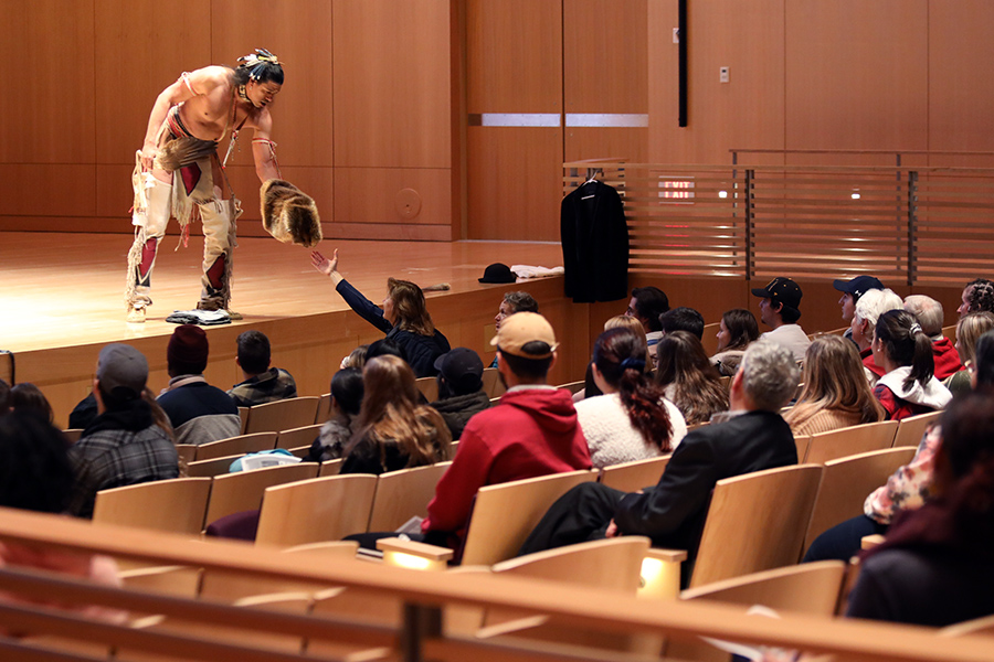 Guests walked into the dimly lit Concert Hall of the Fine Arts Instructional Center and were directed to sit center stage. When the performance began, it was clear that Weeden had asked for the arrangement to allow the audience to have a full experience. The performance began with Weeden singing from the top back steps of the concert hall, making his way down to the front as he sang and danced between aisles, at times stopping in front of audience members to allow them to observe his performance and regalia.