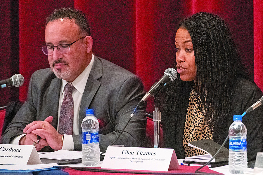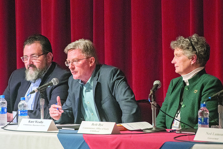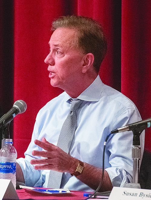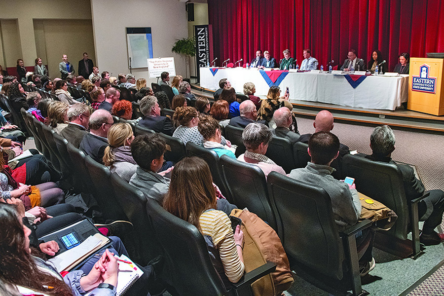 It was a standing room only crowd on Wednesday night, Feb. 26 in the Student Center Theater at Eastern Connecticut State University when Governor Ned Lamont was joined by Lt. Gov. Susan Bysiewicz and five commissioners for a town hall meeting on workforce education.