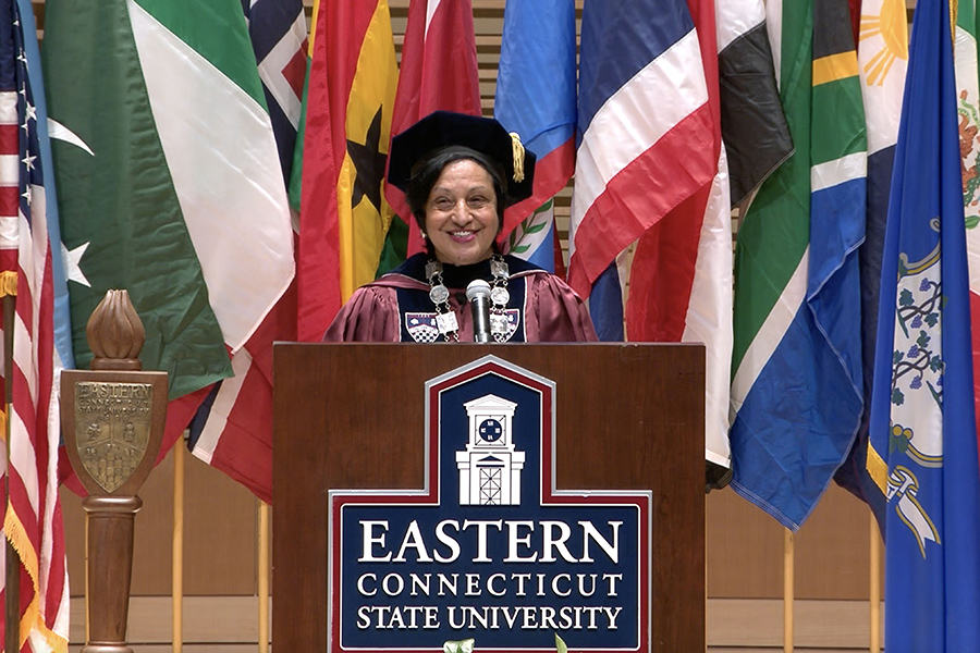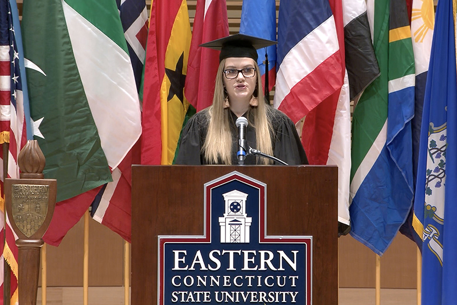 This year’s event was videotaped in Eastern’s otherwise empty Concert Hall in the Fine Arts Instructional Center, with each speaker taping their remarks separately in keeping with safety guidelines. Even as a virtual event, the graduation ceremony maintained an atmosphere of grace and dignity, with the stage a replica of the one used at the XL Center and “Pomp and Circumstance” and “America the Beautiful” played during the proceedings. At the end of the formal program, graduates watched as their names scrolled on the screen, sharing the celebration safely at home with their families.