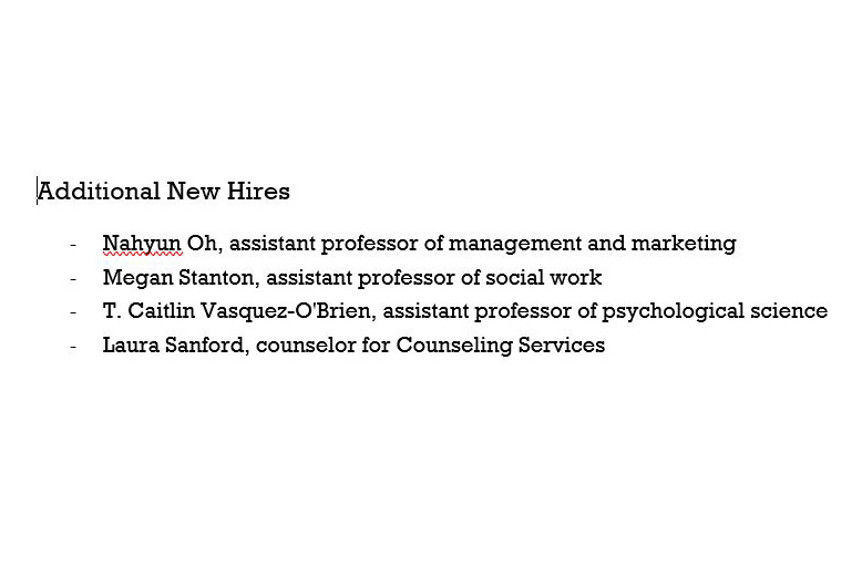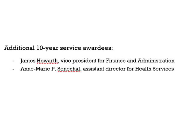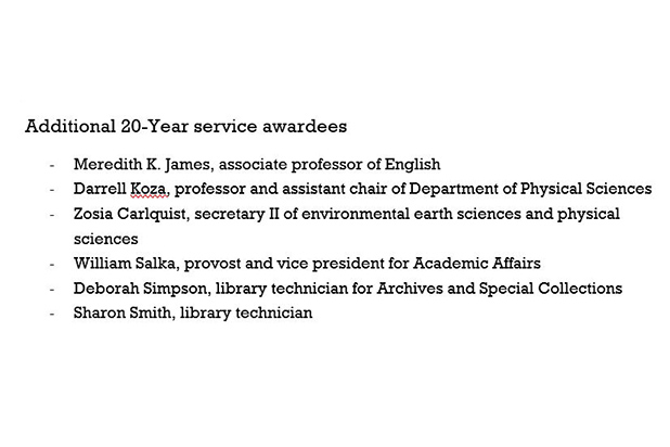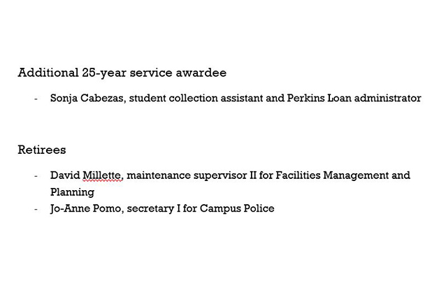 Following Salka’s introduction, 12 new faculty and six new staff members were introduced to the university community. Vice President of Institutional Advancement Ken DeLisa recognized 22 faculty and staff members for reaching milestones of 10, 20 and 25 years of service, and acknowledged additional employees who are retiring.
