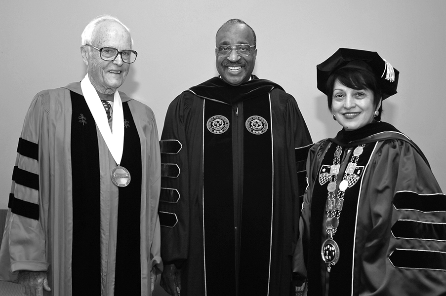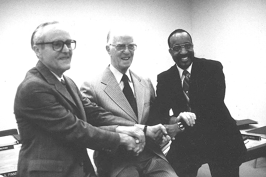 President Webb also enjoyed and contributed to the campus culture. His musical group, “Grooves of Academe,” often played at campus events, and featured Professor Kenneth Parzych on drums, Professor Ed Drew on bass, and President Webb on vibraphone. Associate Dean Sophie Jenkins sometimes joined the group on accordion and adjunct professor Frederick “Doc” Mirliani occasionally played saxophone.
