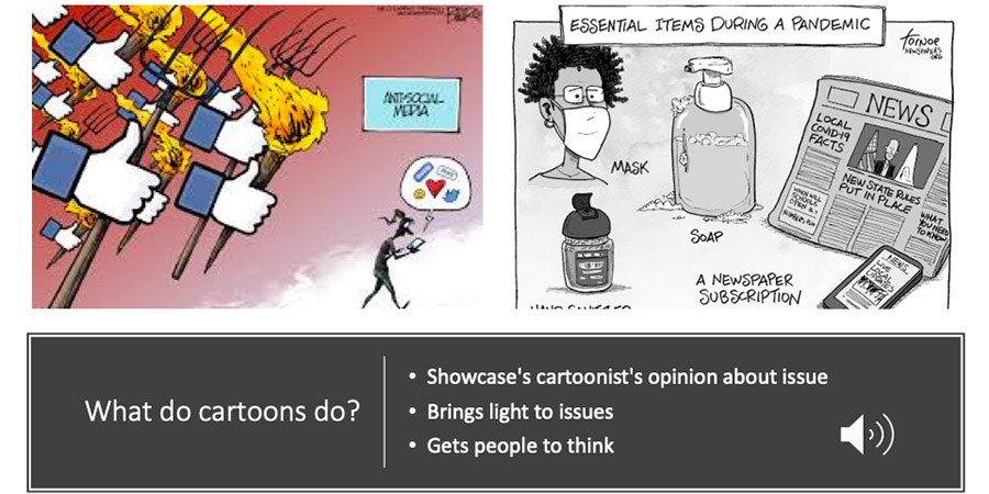 Sophomore communication major Emily Hailu, whose oral presentation is titled “Editorial Cartooning and Freedom of Speech,” said, “One of the biggest challenges for me was making sure my presentation was as engaging and attention grabbing as it would be in person. I enjoy the thrill of presenting to a live audience and having a pre-recorded presentation made it more difficult for me to imagine the thoughts of the viewers.”