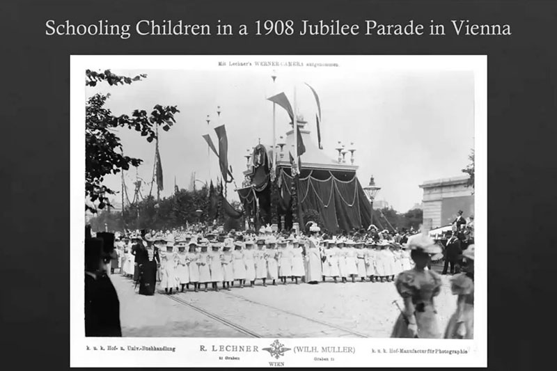 "In every school, dozens of school events were designed to make the monarch as tangible as possible and to make children loyal to the dynasty,” said Moore. “Joseph gave speeches, opened railroad stations and attended many public events. Jubilees and parades in Vienna were designed to commemorate him for more than 60 years. Statues were erected in his honor. Children went to events to see him, including the palace itself.”