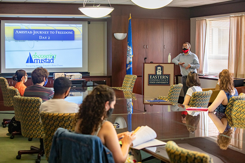 The program will serve more than 1,000 students from the Hartford, Bloomfield, East Hartford, Windsor and Farmington school districts. Prior to their presentations, which will occur in person in the districts’ classrooms, Eastern students will be trained by Discovering Amistad staff.