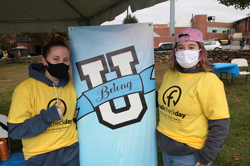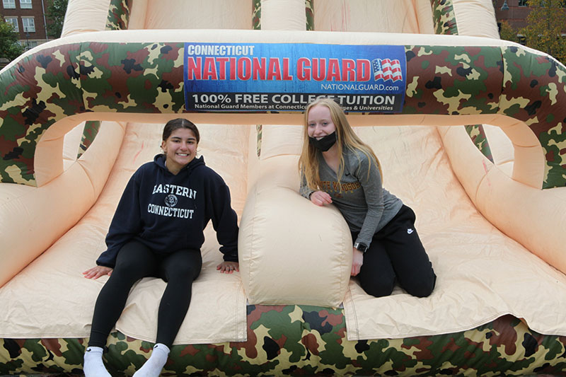 Fresh Check Day offered therapy dogs and wellness screenings. Twelve student club booths with messages decorated the Webb Hall lawn, including “Elephant in the Room” by Wellness Warriors; “Be Yourself: Letting Go of Stigma” by the NAACP; “Know Your Limits: How Alcohol Affects Mental Health” by M.A.L.E.S.; “YOUnique: Trash Your Insecurities” by O.A.S; “Thrive” by Cheers; “100 Reasons” by the Billiards Club; “UBelong” by Diversability; and “It Takes a Village” by the Student Government Association. The Connecticut National Guard offered a huge rubber slide with the message “We All Need a Little Help Getting Over the Hurdle.”