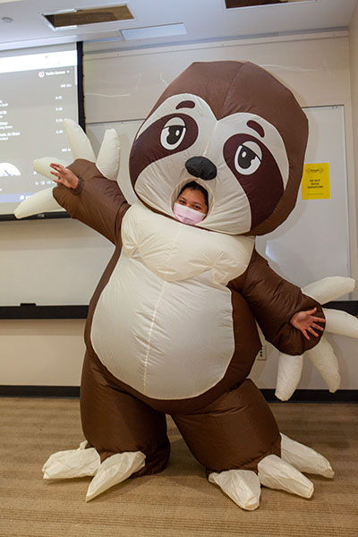 A member of FEMALES attends meeting in an inflatable sloth costume.