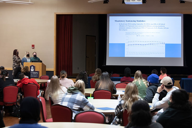 After the opening remarks and overview from junior social work students Molly Boucher and Quinton Sneed-Lott, the day continued with students presenting their research on issues surrounding mass incarceration. Students also displayed their findings by crafting posterboards for attendees to visit.