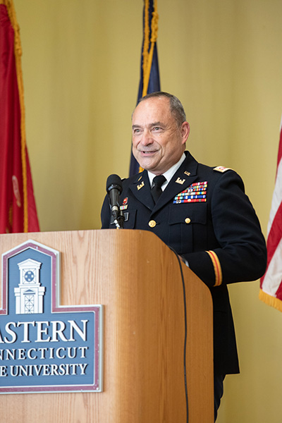 Lt. Colonel Joe Danao ’89, who retired after a distinguished 33-year career with the Connecticut Army National Guard, delivered the keynote address. Danao was deployed in Afghanistan. His wife, son and son-in-law are also veterans. His daughter Ashley is an Eastern graduate as well.