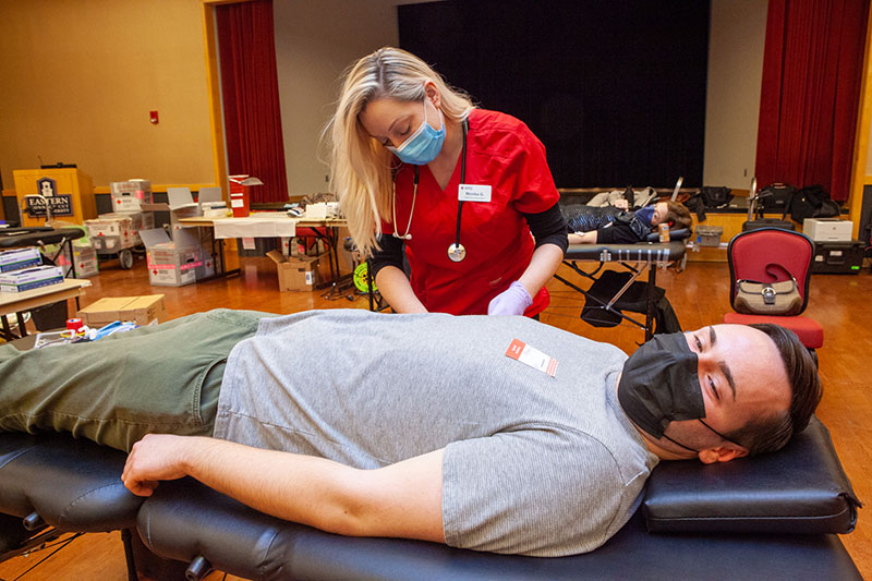 The Eastern campus community continued its efforts to save lives by participating in the University's 10th "Be the Match" bone marrow registry on Feb. 2 and ongoing Red Cross blood drives on Feb. 1 and 2. Be The Match seeks to find eligible donors for the thousands of people diagnosed with rare blood diseases. The bone marrow registry event was sponsored by the men’s soccer team and held in the Sports Center Lobby and the blood blood drives, co-sponsored by the Campus Ministry and Center for Community Engagement, were held in the Betty R. Tipton Room.