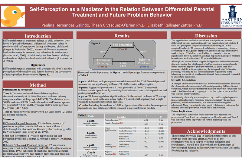 Galindo’s project was titled “Self-Perception as a Mediator in the Relation Between Differential Parental Treatment and Future Problem Behavior,” and investigated the correlation between parental treatment and how that influences a child’s negative or positive self-perception. “The experience of growing up with two other siblings guided my interests in selecting the research topic of differential parenting techniques and their relation to children’s self-perception,” said Galindo. “With the advantage of longitudinal data, I further explored how the first two variables may relate to future problems and or prosocial behaviors.”