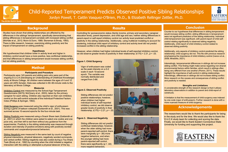 Powell’s project was titled “Child-Reported Temperament Predicts Observed Positive Sibling Relationships,” and included 145 parent and sibling participants to measure the correlation between siblings and how their temper results in sibling conflict.