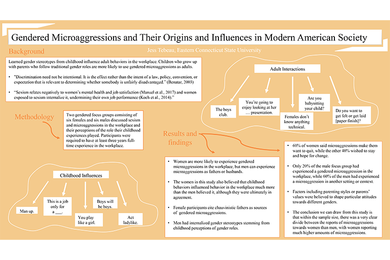 Tebeau hopes that by presenting her research, “My fellow students can begin to notice gendered microaggressions in their own future or current professional field and stop any hate and harassment in its tracks. The mental effects from gendered microaggressions in the workforce can be career-defining and incredibly harmful.”