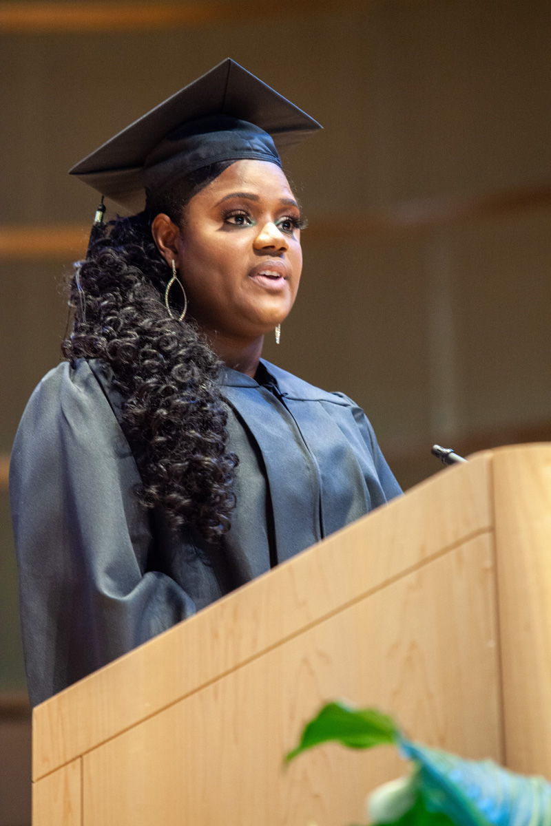 Tanisha Markland '22, a graduate of the Organizational Management Program, gave remarks on behalf of the students. "As an adult learner who works two jobs while balancing work and family commitments, there was no shortage of feeling that there were not enough hours in a day to do all the work," said Markland. "But with certainty I say this today, it was all worth it!