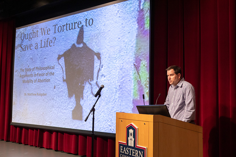 Rukgaber presented a philosophical perspective with a slide show titled, “Ought We Torture to Save a Life? State of Philosophical Arguments in Favor of the Morality of Abortion.” His perspective was based largely on Judith Jarvis Thomson’s idea that the right to life is not the right not to be killed, but the right not to be killed unjustly.