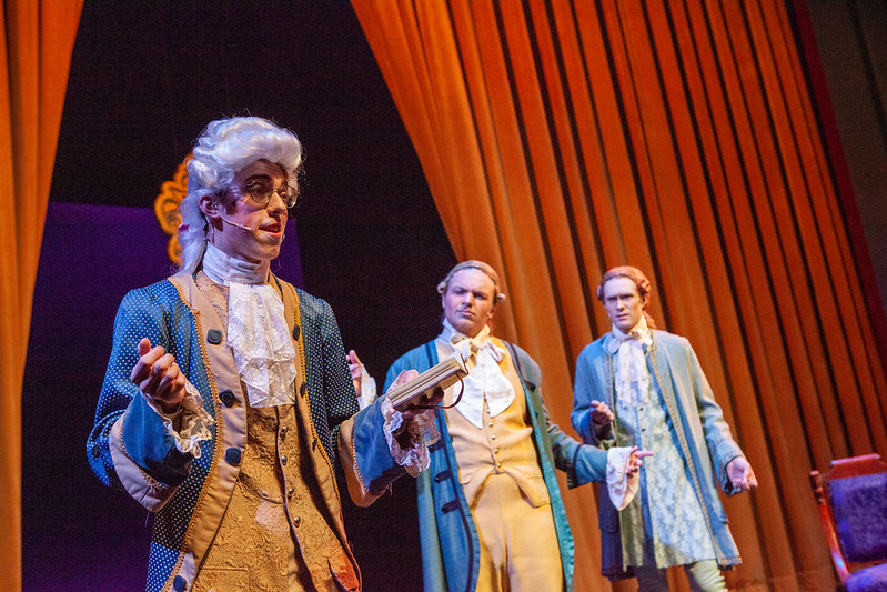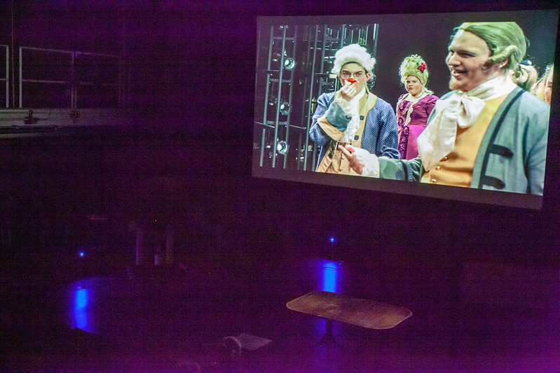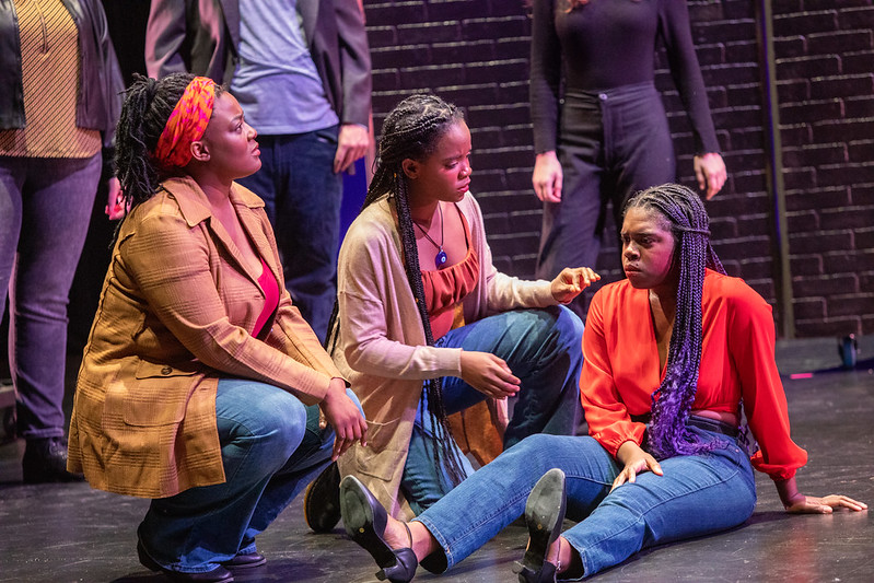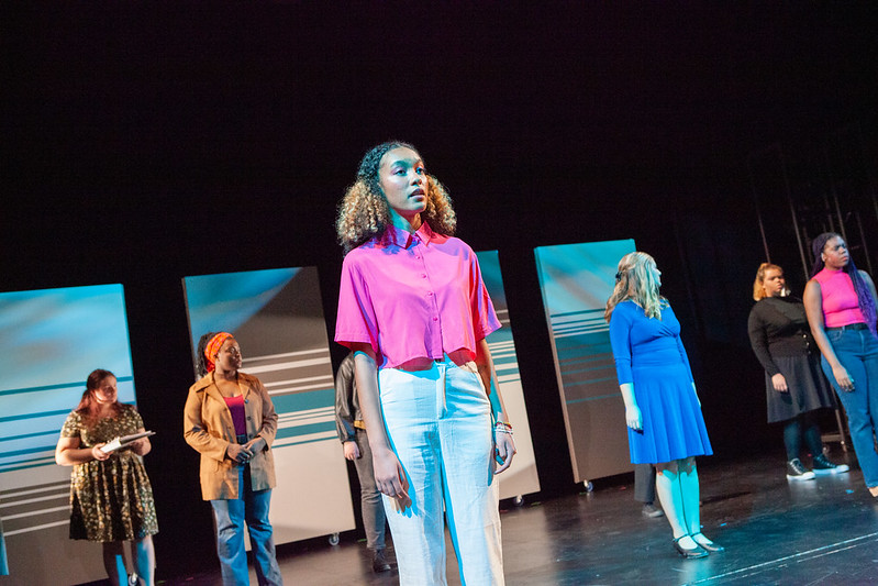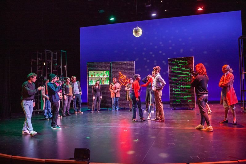 The dual format also allowed students to work in two mediums and across centuries of play and performance twists. The immediacy of stage acting was contrasted with the intimacy of film, with its close-ups and filmed backstage asides. The actors directed their own versions of the story they wanted to tell, at one point even throwing out the play director, acted by senior theatre major Joy Ikechukwu: “We don’t hate you, we just don’t need you right now,” they told her. At another point, actor Tyler Warren, a first-year theatre major, delivered an improv comedy skit.