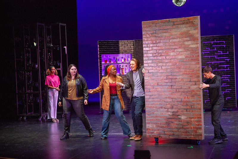 Where the play ends and where real life begins was also a constant worry for the actors as they wrestled with illusion and their life stories. As Bonnie Mentz, a first-year student double majoring in elementary education and theatre, playing a stagehand, said, “The actors become people.” But reality reared an ugly side, too, when actress Jasmin Lee Clark, a junior Theatre major, repeatedly ducked a stage slap from her actor-boyfriend, played by Maleryn, even as she was trained onstage in how to perform it.