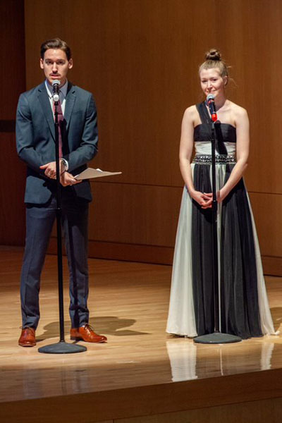 As part of their program descriptions, performers wrote essays of 120 to 170 words professing their love for their selections, which were read by student emcees Sarah Burkart and Kane Waggoner. Performers’ program notes were 80-90 words long and were projected on an overhead screen during their performances.