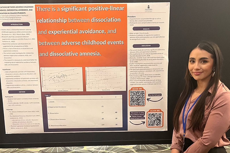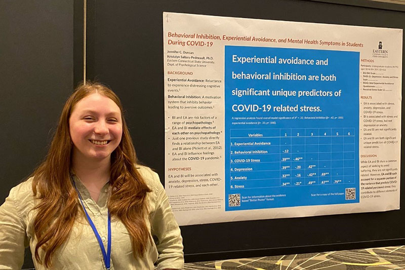 Salters-Pedneault joined research assistant Jennifer Duncan to present “Behavioral Inhibition, Experiential Avoidance, and Mental Health in Students During COVID-19.” She then partnered with research assistant Melissa Valenzuela for a presentation titled “Associations Between Adverse Childhood Experiences, Experiential Avoidance, and Dissociation in College Students.”