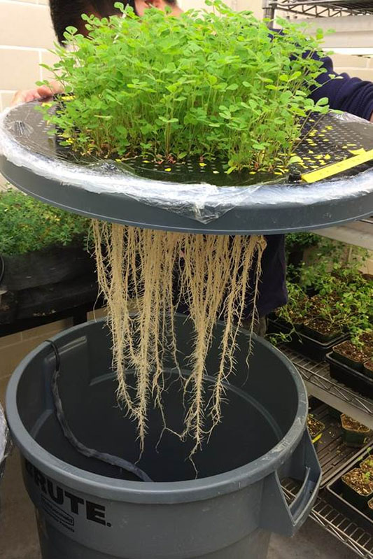 Veerappan, a molecular geneticist, uses the system to grow a model legume plant, “Medicago truncatula,” known commonly as barrel medic or barrelclover, to study the genetics of how the legume fixes nitrogen. Unlike other plants, legumes such as peas and beans can convert the nitrogen in the soil, or in this case, the air, to ammonia, a nutrient that plants can absorb, through a symbiotic relationship with bacteria. Veerappan creates mutations in genes to produce some plants that are nitrogen deficient. The mutants can be compared with normal plants that he grows aeroponically. They fix nitrogen with bacteria that he injects into the plants’ nutrient solution.