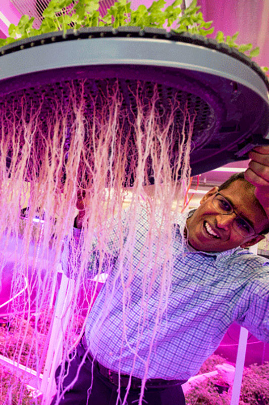 The model plant Veerappan uses needs only four weeks to grow, another advantage for the researchers. The roots are much longer than they would be if grown in soil, still another advantage. They hang down from the plant in long strands that his lab calls “Rapunzel’s hair.”