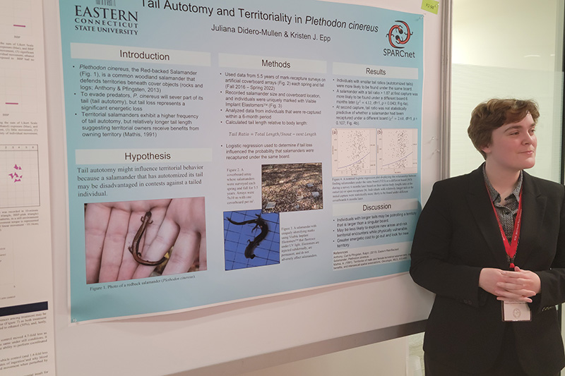 Other students presenting at the conference were Anne Le ’25, also working with Veerappan, and Juliana Didero-Mullen ‘23, who worked with Epp. Didero-Mullen’s research on the Red-backed Salamander was a study of how losing the end of its tail to evade predators affects the salamander’s territorial behavior. Le studied the novel genes that control symbiotic nitrogen fixation in the legume plant, Medicago truncatula.