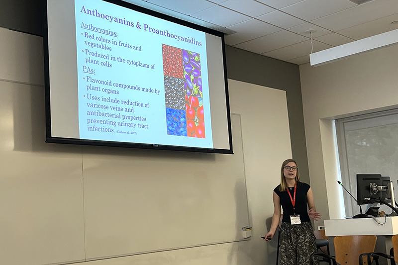 Megan Piechowicz ’23, who conducts research with biology Professor Vijay Veerappan, won an excellence award for her presentation on “Phenotypic characterization, identification of mutations and mRNA expression analysis of flavonoid pigmentation mutants in the model legume plant Medicago truncatula.” This was a study of the molecular mechanisms of how two flavonoid compounds in plants, which are responsible for bright colors, are regulated.