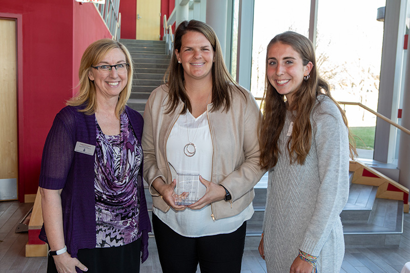 Women’s Soccer Head Coach Sarah Tompkins, who involves her team with the Town Pride Town Wide event each year, won the Faculty/Staff Community Engagement Award. Kelly Mills, volunteer manager for the Windham Recovery Community Center, won the Community Partner Community Engagement award.