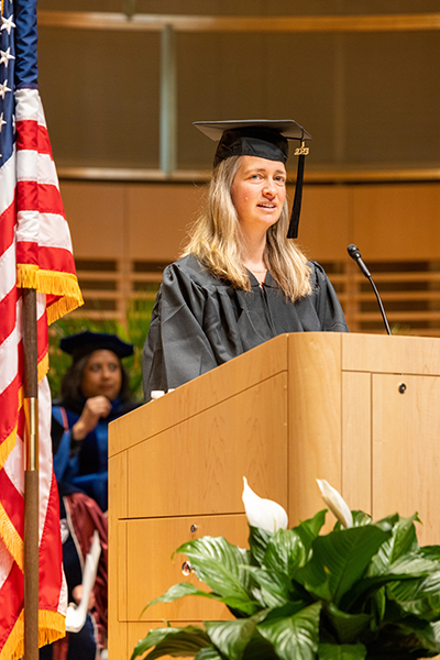 At the ceremony, held in the Fine Arts Instructional Center Concert Hall, Mya Millbauer ’24 sang “America the Beautiful” accompanied by music lecturer David Ballena. The Rev. Diane Peterson Seaborn, soon to be installed as the senior minister of Storrs Congregational Church, offered the benediction, holding 10 seconds of silence for graduates to remember and acknowledge those who have helped them become the person they are.